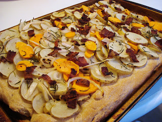 Joe and I made some homemade focaccia dough so that we could eat some pizza before heading out for candy. We made enough for two pizzas. One had sausage, onions, squash, pineapple, tomatoes and jalapeno on top. For the other one, I sliced up four small russet potatoes and one small yam, tossed them with onion, olive oil and rosemary, then sprinkled some chopped bacon on top (Grandpa’s request). It was delicious! I think it will be even better next time with a garlic and herb crust.